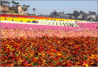 カールスバッドのフラワーフィールドでは、3月上旬から5月上旬にかけてラナンキュラスの花が見事に咲き誇る。