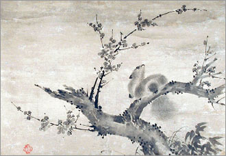 | Squirrel and Plum blossom Branch (detail) by Motonobu Kano, 16-17th century. Japan painting hanging scroll, Ink on paper © Bequest of Elsie S. Kimberly The San Diego Museum of Art. |