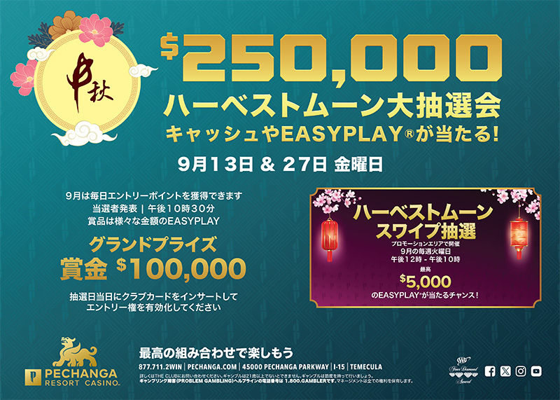 カリフォルニア州テメキュラ - Pechanga Resort Casinoは9月を通して総額25万ドルのEasy Playやキャッシュが当たるハーベストムーン プロモーションを開催しています。
