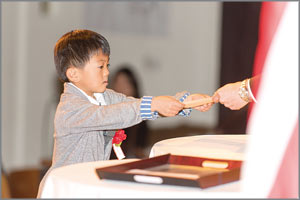 日米国歌を斉唱し、「すみれ組」 担任のガイオン千里先生、「ゆり組」担任の草野里香先生、ばら組担当のオベーリ由美先生が卒園生の名前を読み上げると、それぞれ元気よく返事をして、ステージ上で、荒川園長先生から一人ひとりに卒園証書が手渡されました。