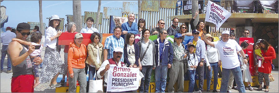 | 国境を越えて、海の中まで続く国境の壁( 円内) を見学。TIJUANA のサインボードを囲んでの集合写真 |