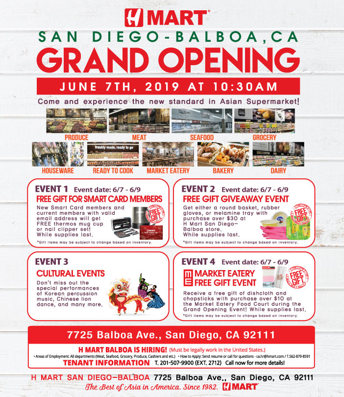 全米に65店舗を展開するアジア系スーパーマーケットチェーン Hマートが、6月7日金曜日午前10時30分、サンディエゴで2店舗目となるストアをバルボアアベニューにオープンします。