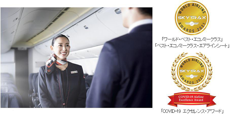 JALグループは世界中の航空ユーザーを対象に調査を行った結果で表彰するSKYTRAX 社 (*1) の「ワールド・エアライン・アワード2021」 (*2) において、エコノミークラスの機内食やスタッフのサービスなどの総合評価で、世界で最も優れているエコノミークラスサービスとして、「ワールド・ベスト・エコノミークラス」 を2期連続で受賞し、また世界で最も優れているエコノミークラスシートとして「ベスト・エコノミークラス・エアラインシート」も4期連続(5回目)で受賞した。