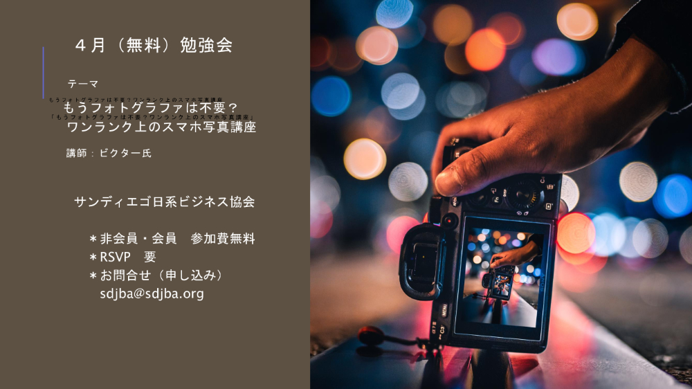 NPO法人サンディエゴ日系ビジネス協会SDJBA (San Diego Japanese Business Association) では、来る4月21日(木)、「4月(無料)勉強会」を開催します。