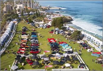 息を呑むような海景色が望める、見晴らし抜群のラホヤ・コーブの公園 (Ellen Browning Scripps Park, 1100 Coast Blvd.) にエレガントなクラシックカーが勢揃いする、カーマニア必見の品評会。