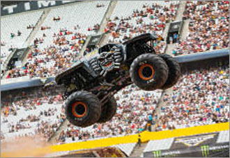 直径1.7メートルの巨大タイヤを装着した、全長5メートル以上の重量級トラック (4.5トン/2,000馬力) がレース場となるペトコパークを爆走し、炎の中をくぐり、障害物を越えて轟音とともに宙に舞うスペクタクル。
