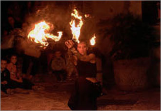 アクロバット芸、コメディショーなどが披露されるが、注目のパフォーマンスは野生的で荘厳さを感じさせる火焔曲芸 「ファイヤージャグリング」。
