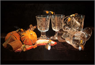 17世紀ヨーロッパの静物画に構図のヒントを得て、水晶や輸入磁器などの高級品、さらに昆虫や腐敗の象徴を「メメント・モリ (死の記憶)」として描いたという。