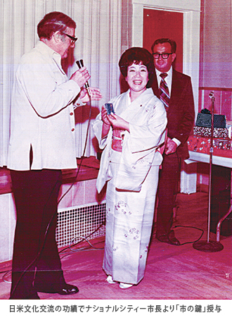 経歴:福岡県出身。1959年渡米。1973年1月、「サンディエゴ俳句会」を創立。1994年1月に「フォーシーズン俳句クラス」と改称して、通信制度による俳句会を結社。俳人協会評議員(1989年)、同名誉会員(2018年、アメリカではただ一人)。芭蕉祭俳句コンテスト選者(2000年~2020年)。羅府新報新年俳句選者(2008年~現在)。日米文化交流の功績でナショナルシティー市長より「市の鍵」授与(1977年=右下写真)。表千家茶道教授、「四季の会」主宰(1998年~現在)。