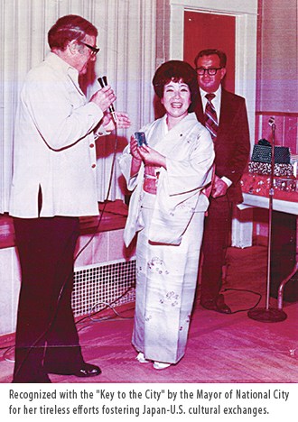 Recognized with the "Key to the City" by the Mayor of National City for her tireless efforts fostering Japan-U.S. cultural exchanges (1977=lower right photo).