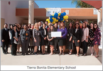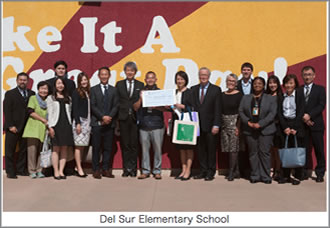 セレモニーでは、日本語講座講師給与助成事業を通じて講座立ち上げを支援した国際交流基金ロサンゼルス日本文化センター内田所長から両小学校校長へ小切手(合計6万ドル)が贈呈されました。