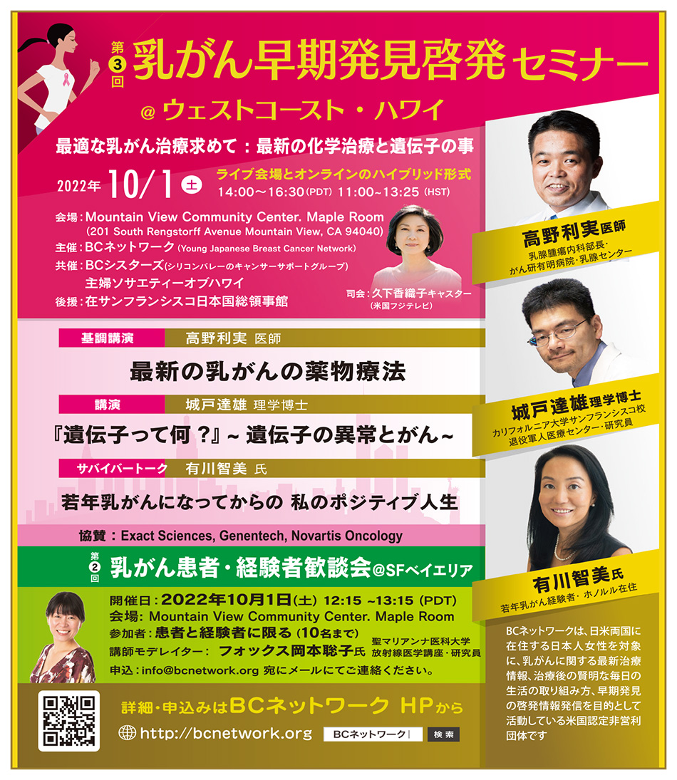 申し込みいただいた方には開催日数日前にメールにて視聴URLをお送りします。 - 共催:BCシスターズ(シリコンバレーのキャンサーサポートグループ)、主婦ソサエティーオブハワイ