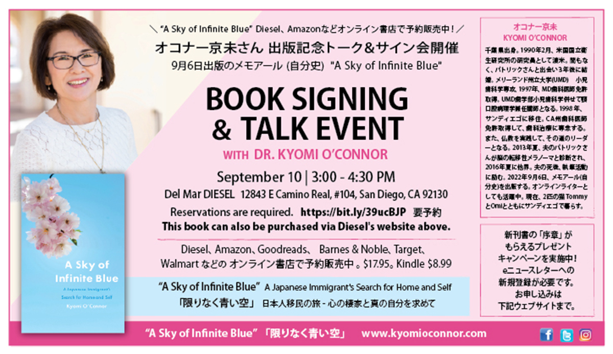 来る9月10日(土)午後3時から、サンディエゴ在住のオコナー京未(KYOMI O’CONNOR)さんのメモアール(自分史) “A Sky of Infinite Blue”(www.kyomioconnor.com ) の出版を記念して、デルマーのブックストア、DIESEL(12843 E Camino Real, #104, San Diego, CA 92130)にて、トーク&サイン会が開催されます。