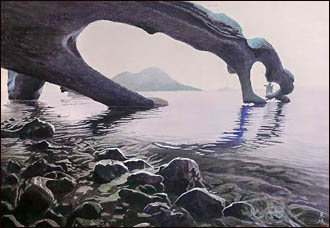 保科さんは、日本の自然や風景を西洋絵画の写実的な表現方法を用い、日本画で使用される岩絵の具を用いて表現しています。
