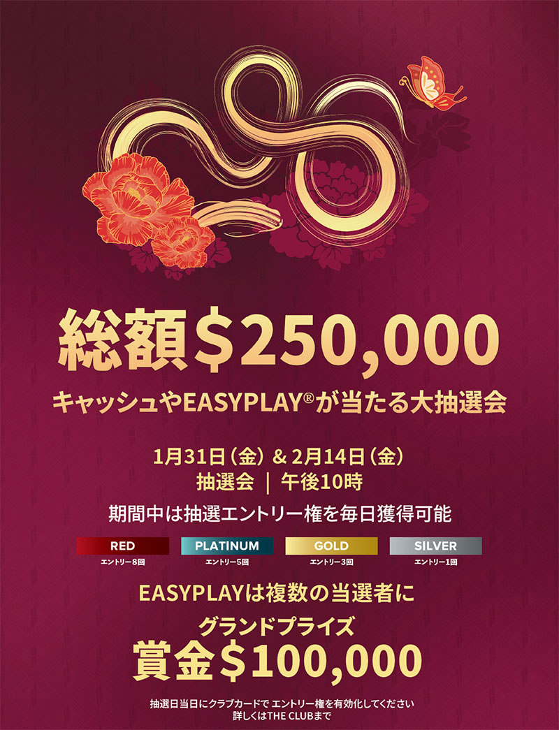 Pechanga Resort Casinoでは、新年を祝い、現金やEasyPlayが当たる賞品総額25万ドルの大抽選会をご用意して、皆様のお越しをお待ちしています。