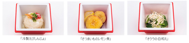 ベトナムを代表する海産物である海老に梅のアクセントを添えた「冷製えびしんじょ」、日本でのレモンの生産量が全国一位で、シェフのレストランの所在地でもある広島県を感じられる「さつまいものレモン煮」、「未来の食材50」よりオクラと胡麻を使用しやさしい味わいのヘルシー料理「オクラの白和え」を用意している。