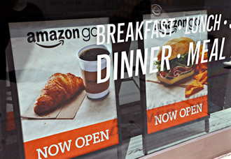 2018年から米国で展開するアマゾン・ゴーでは、自動改札のようなゲートにスマートフォンのアプリや登録済みクレジットカードなどをかざして入店すれば、棚から商品を手に取ってそのまま店の外に出ることができる。