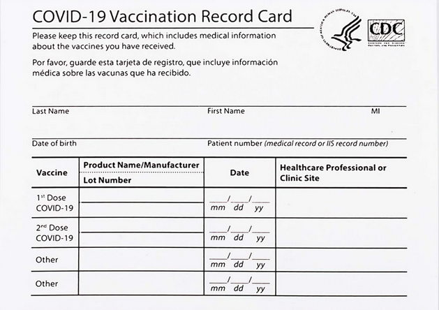 米国疾病管理予防センター発行の紙のカードと同じ情報 (氏名、誕生日、接種日、ワクチン名などのテキスト) が含まれている。