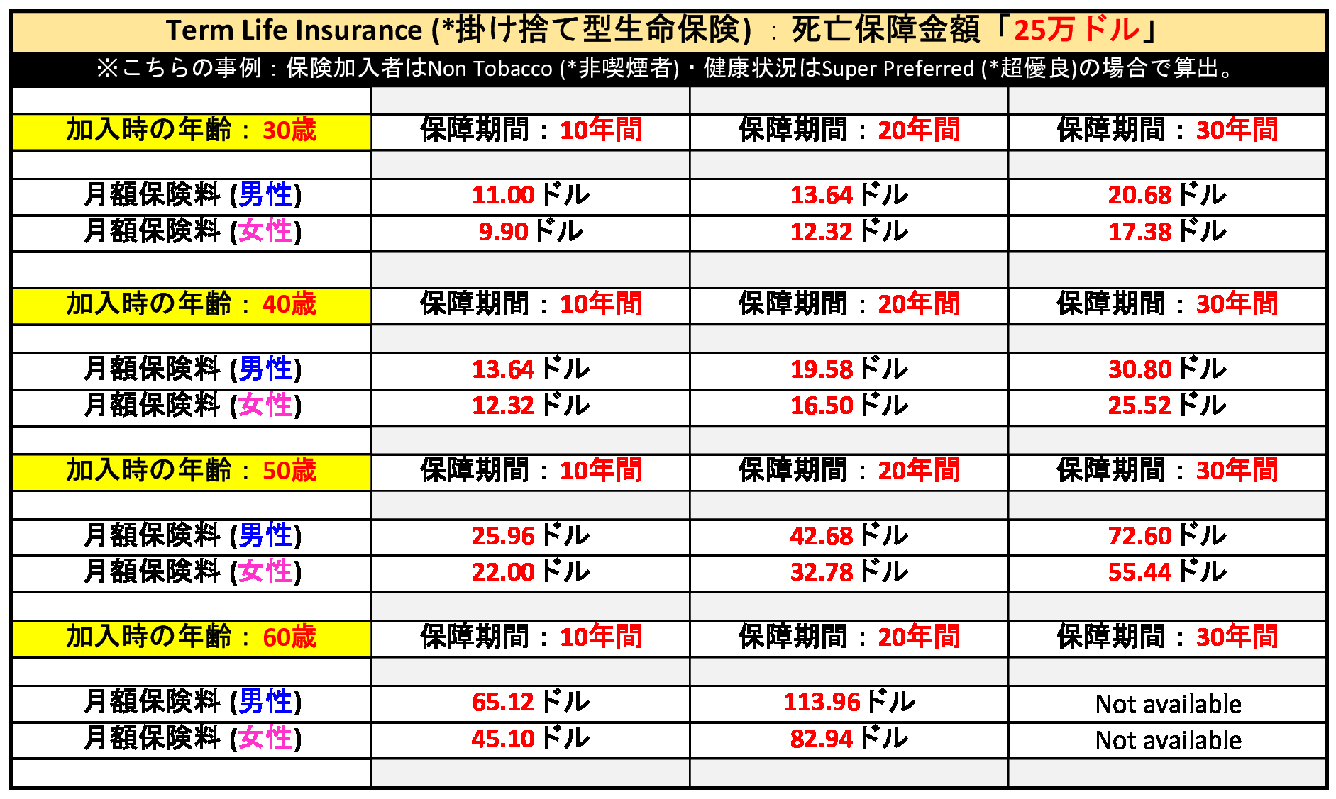 反面、大きな死亡保障に対し、保険料が安価に設定されている生命保険が、掛け捨て型 (Term Life Insurance)となります。